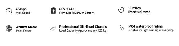 High-Performance Brushless Motor with Enhanced TorquePowered by a 2500W motor with a peak output of 4300W, this vehicle delivers an incredible burst of power with a torque rating of 253NM at 3800RPM. The motor’s built-in gearbox further boosts its torque, making it perfect for tackling challenging terrains and providing an exhilarating riding experience.